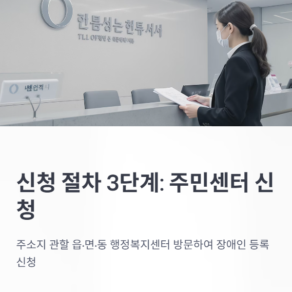 | 3. 주민센터 신청 | 주소지 관할 읍·면·동 행정복지센터 방문, 장애인 등록 신청 | 신분증, 의료서류 일체 |